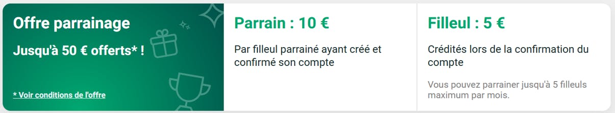 Soit 10€ par filleul, dans la limite de 5 filleuls/mois