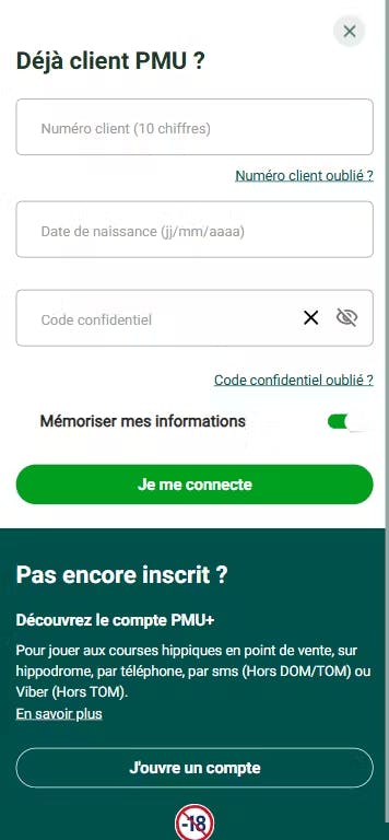 Rendez-vous sur pmu.fr/point-de-vente/ pour vous connecter à votre compte PMU+®. Pour cela, saisissez votre identifiant client, votre date de naissance et votre code confidentiel à 6 chiffres dans la rubrique "Connexion / Inscription" :