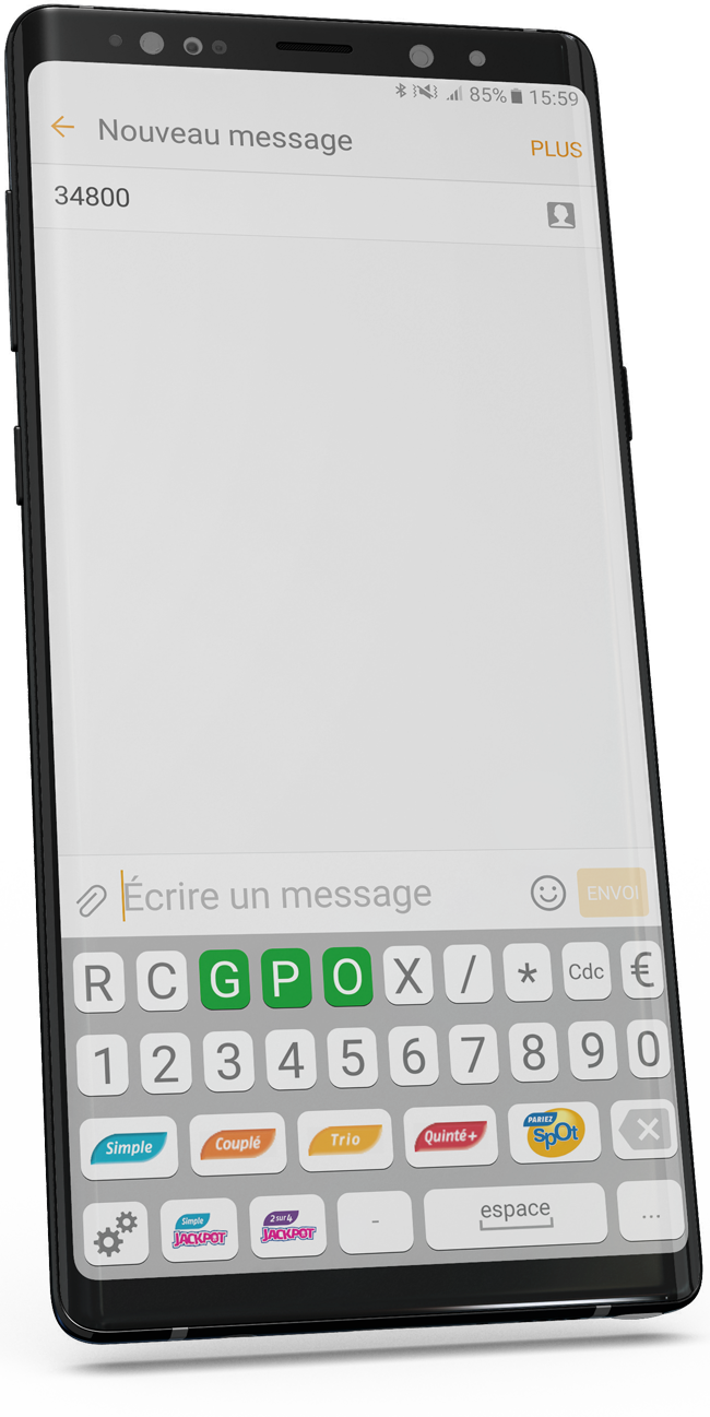 Saisissez votre pari SMS avec le clavier SMS Indiquez une réunion, une course, et un pari à l’aide des touches du clavier. Sélectionnez vos chevaux en les séparant d’un espace. Indiquez le montant de votre pari avec le symbole €. Puis envoyez votre pari au 38 400.